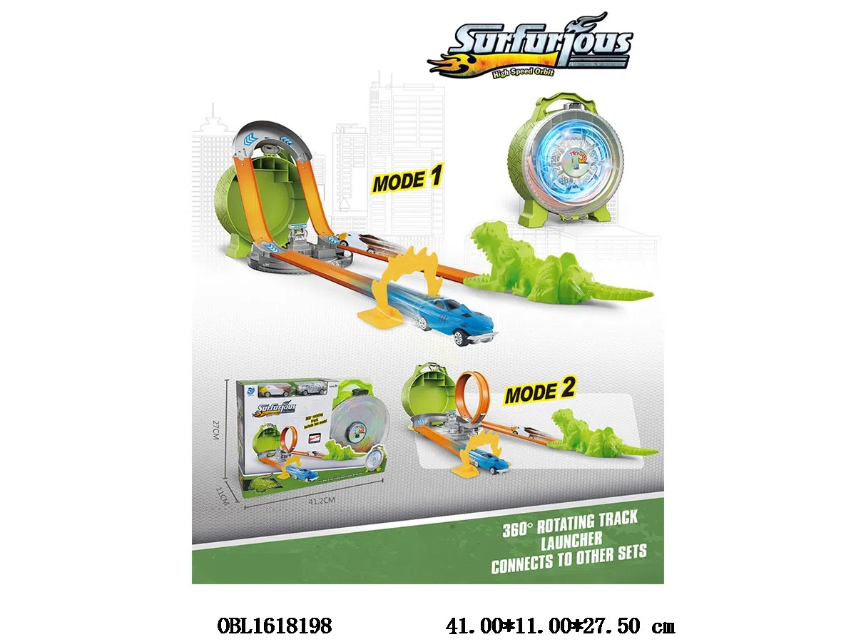 首页 > 压力轨道车 > 按压弹射恐龙轨道合金车套装 配2只滑行小车 车轮带灯光3*AG13纽扣电池包电