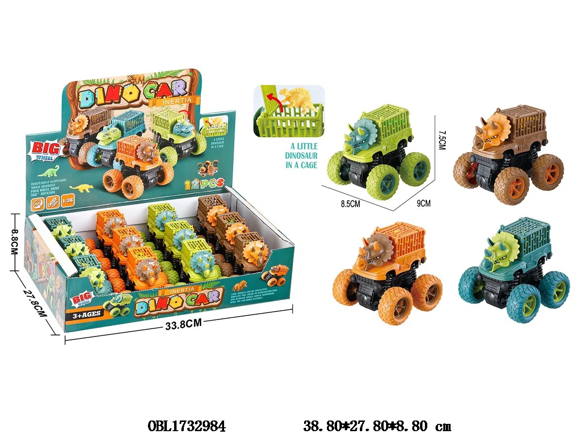 双惯性特技三角龙车 配1只硬料恐龙 12只装一展示盒 4色混装