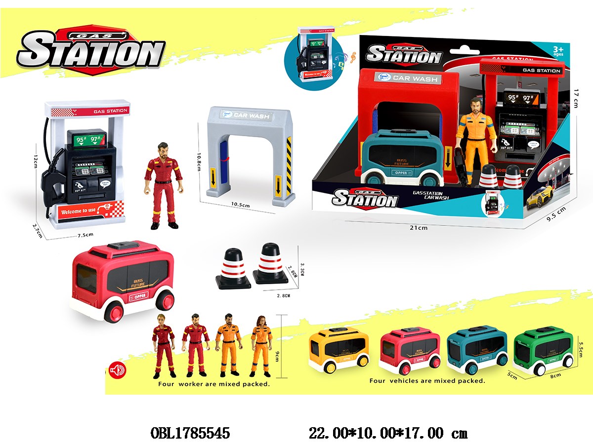 加油/洗车场套装 配1只惯性巴士车 4款混装 加油机带声音 3*AG13包电