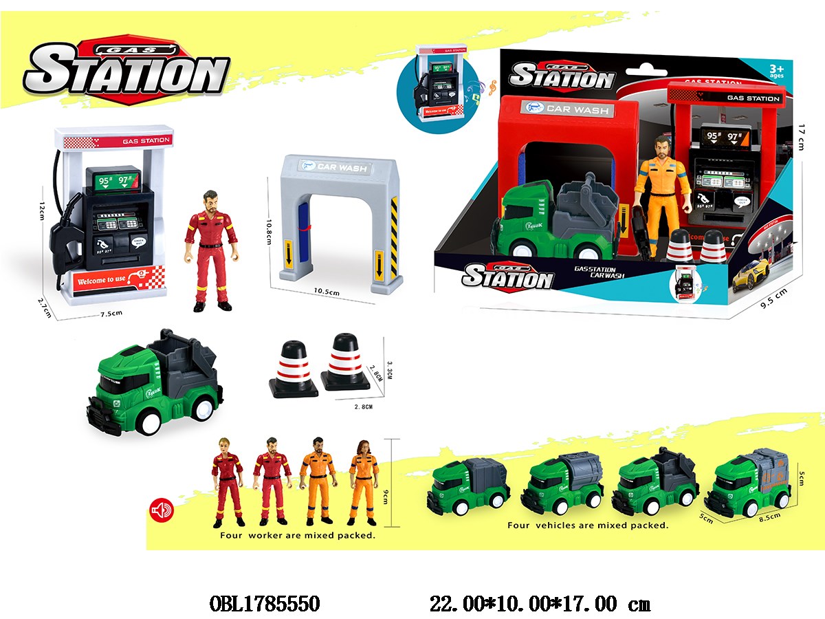 加油/洗车场套装 配1只惯性环卫车 4款混装 加油机带声音 3*AG13包电