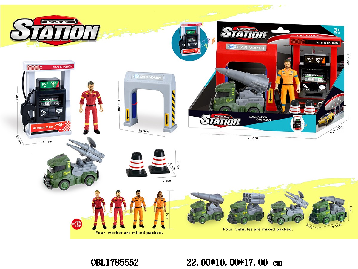 加油/洗车场套装 配1只惯性军事车 4款混装 加油机带声音 3*AG13包电