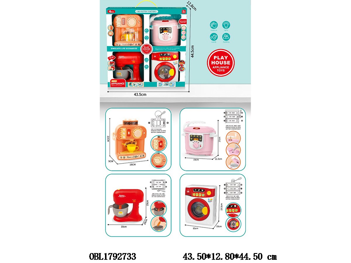 仿真家用电器套装 洗衣机带灯光旋转 3*AA不包电 电饭锅带灯光喷雾 3*AAA不包电 搅拌机2*AA不包电 咖啡机带灯光3*LR44包电