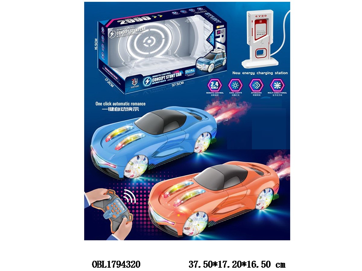 首页 > 遥控车 > 遥控概念车带灯光音乐喷雾 配充电桩 配USB线 车身3.7V锂电池包电 遥控器2*AA不包电 2.4G频率 2色混装