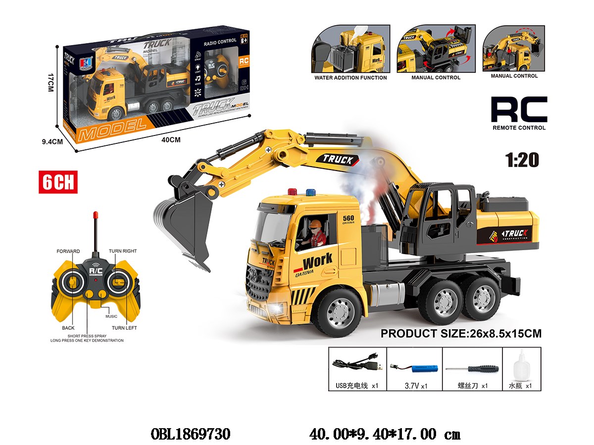 首页 > 遥控车 > 六通遥控挖掘卡车带灯光声音冒烟 配USB线 车身3.7V锂电池包电 遥控器2*AA不包电 49频率