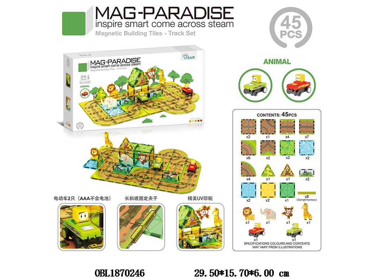 益智磁力片积木 迷你轨道-双车动物 45PCS 电动车2只 各1*AAA不包电