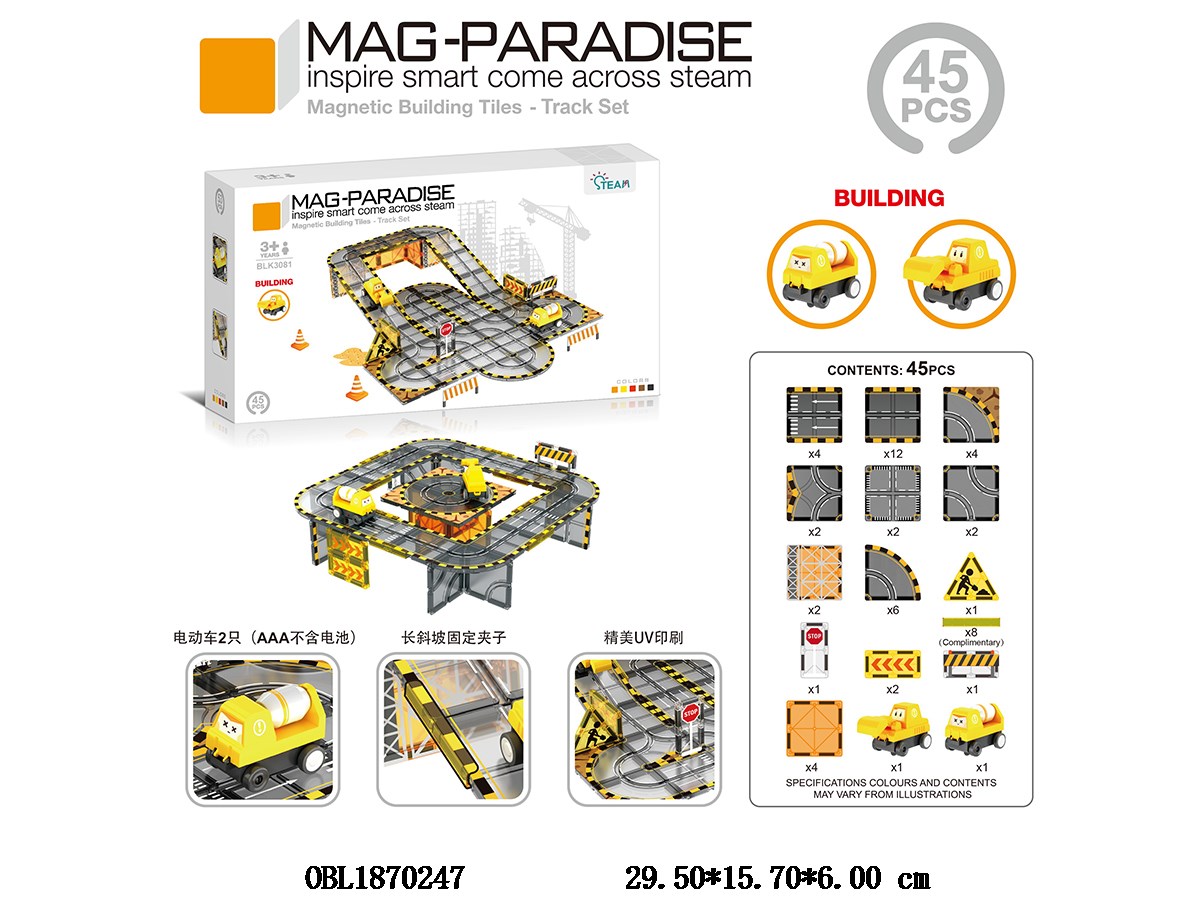 益智磁力片积木 迷你轨道-双车工程 45PCS 电动车2只 各1*AAA不包电
