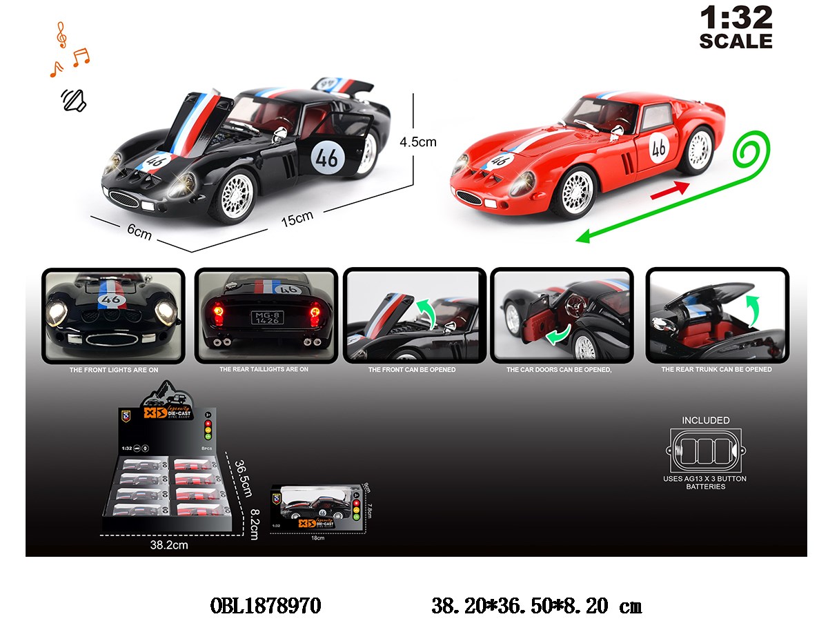 1:32锌合金回力车带灯光声音 可开门 3*AG13包电 2色混装 8小盒装一展示盒