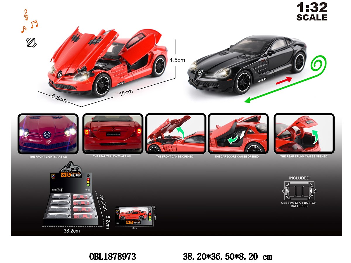 1:32锌合金回力车带灯光声音 可开门 3*AG13包电 2色混装 8小盒装一展示盒