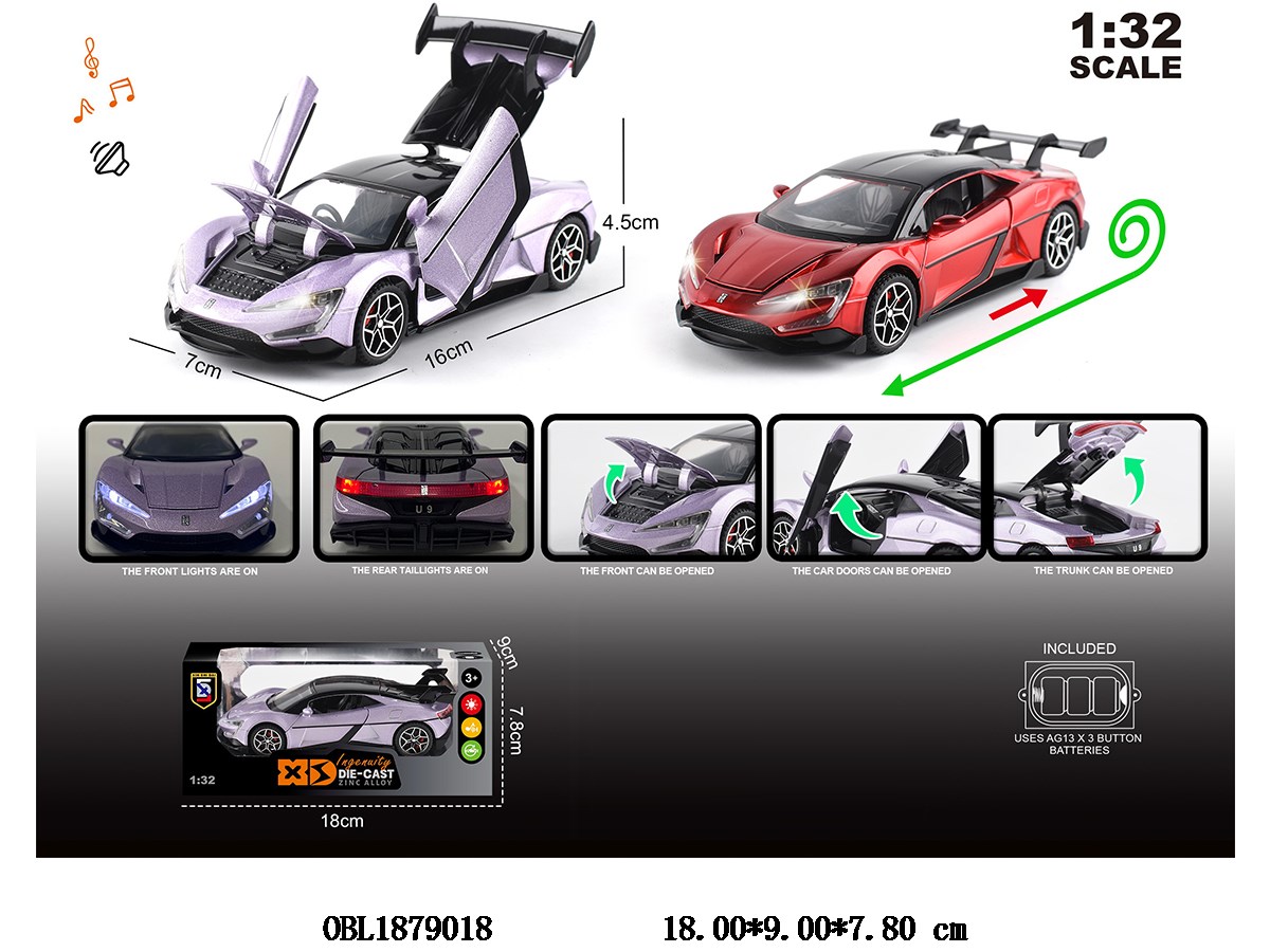 1:32锌合金回力车带灯光声音 可开门 3*AG13包电 2色混装