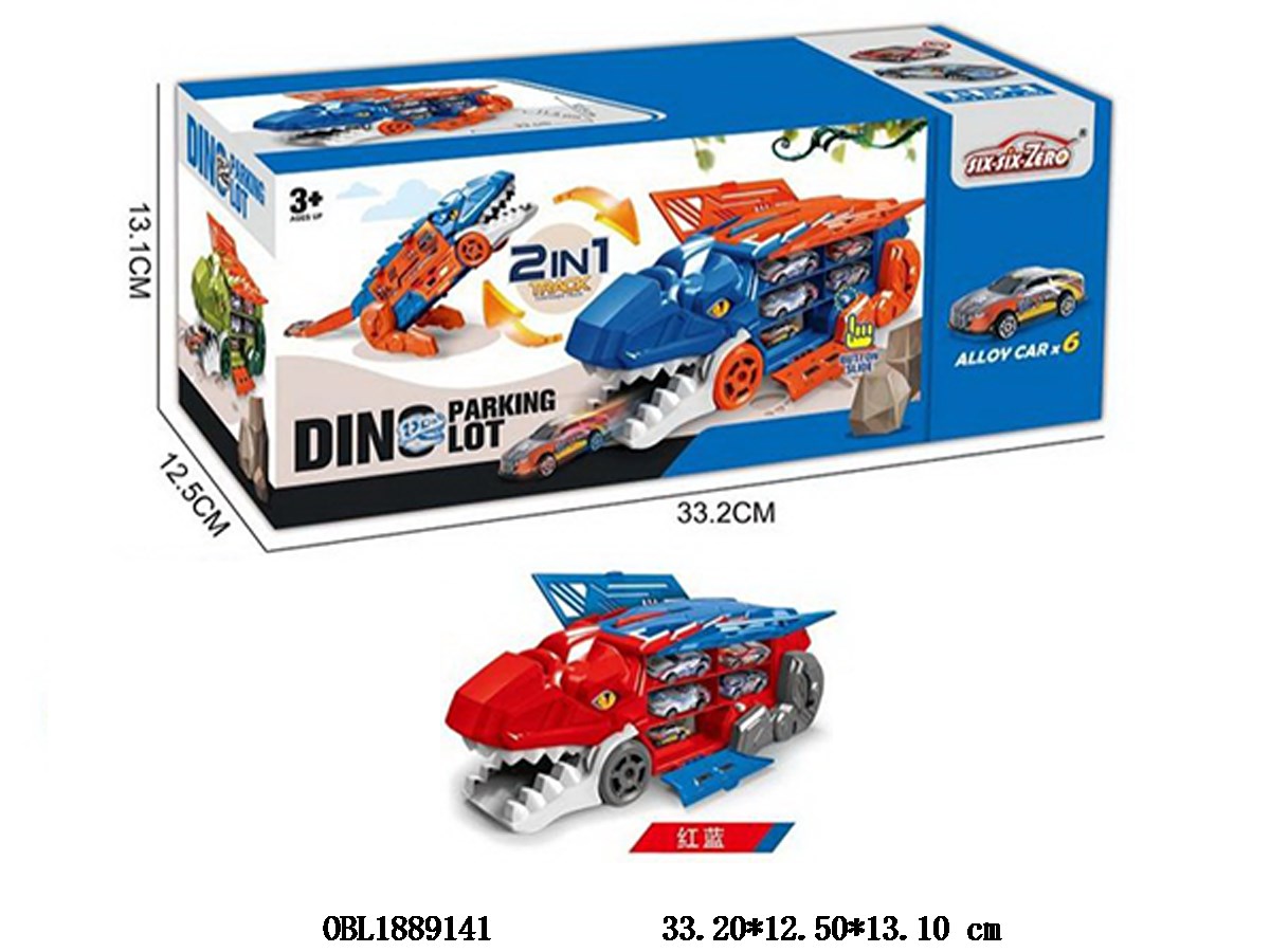 红蓝色变形恐龙合金弹射收纳车套装 配6只合金滑行车