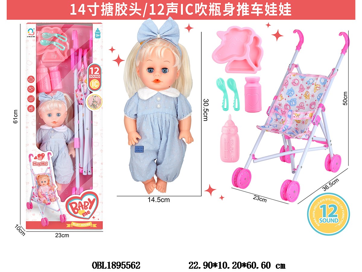 首页 > 带IC芭芘公仔 > 14寸搪胶头空身娃娃套装带12声IC配推车 3*AG13包电 主体衣服1款1色
