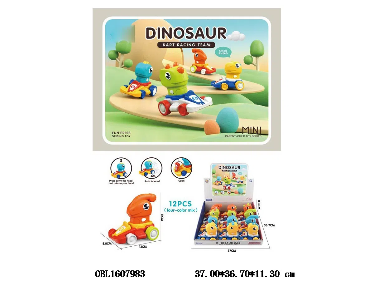 Press sliding dinosaur cute and cool go kart, 4 mixed packs of 12 pieces, 1 display box