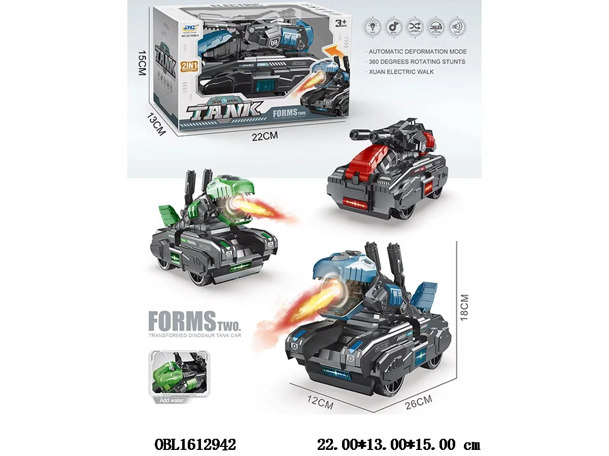 Electric deformation spray dinosaur tank with light, music, 4 * AA, no electricity, tricolor mix