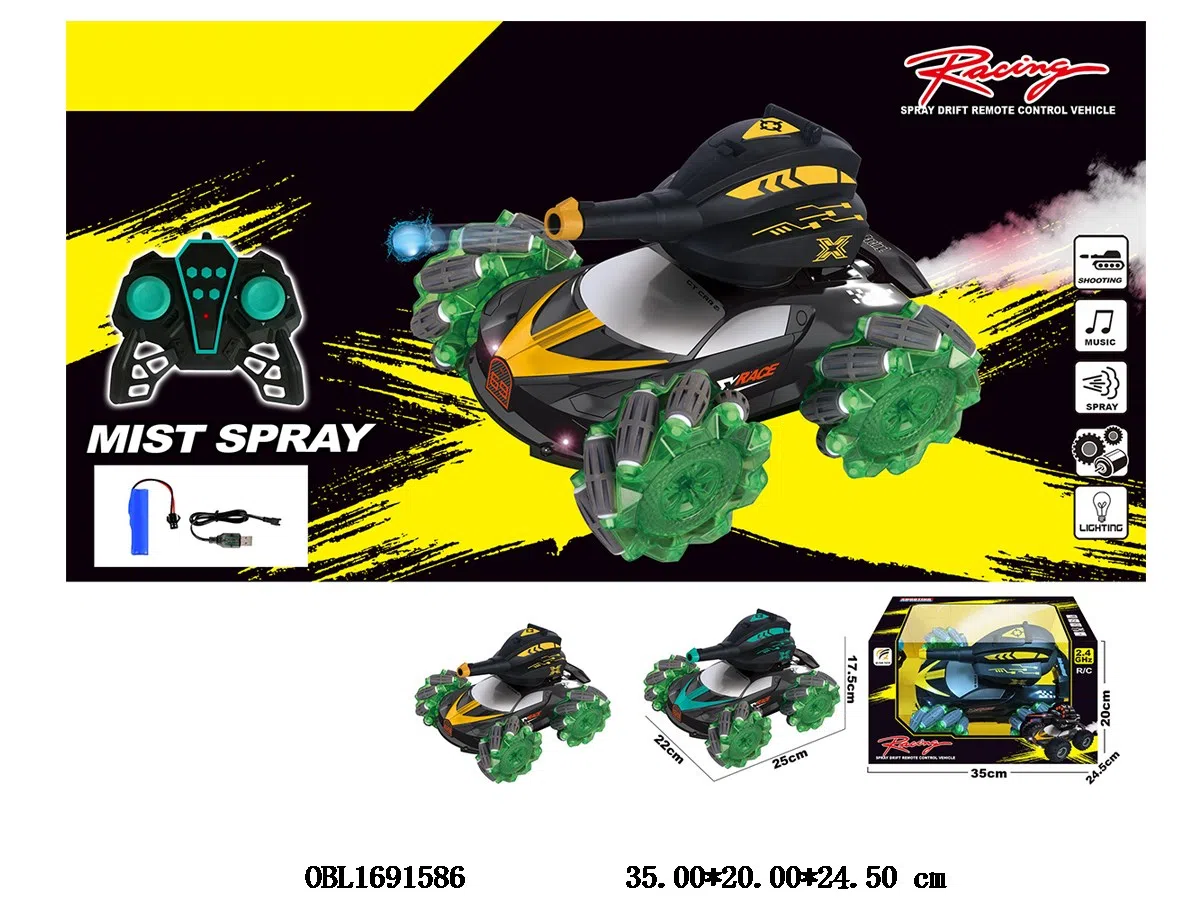 Horizontal remote control car with light, music, spray, drift, launching water bomb, USB cable, body, 3.7V lithium battery pack, electric remote control, 2 * AA, no power pack, 2.4G frequency, 3-color mixed installation