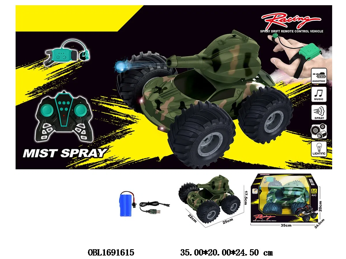 Remote control car with light, music, spray, drift, water bomb, USB cable, body, 7.4V lithium battery, electric remote control, 2 * AA, remote control without electric watch, 1 * CR2032, electric power, 2.4G frequency, 2-color mixed installation