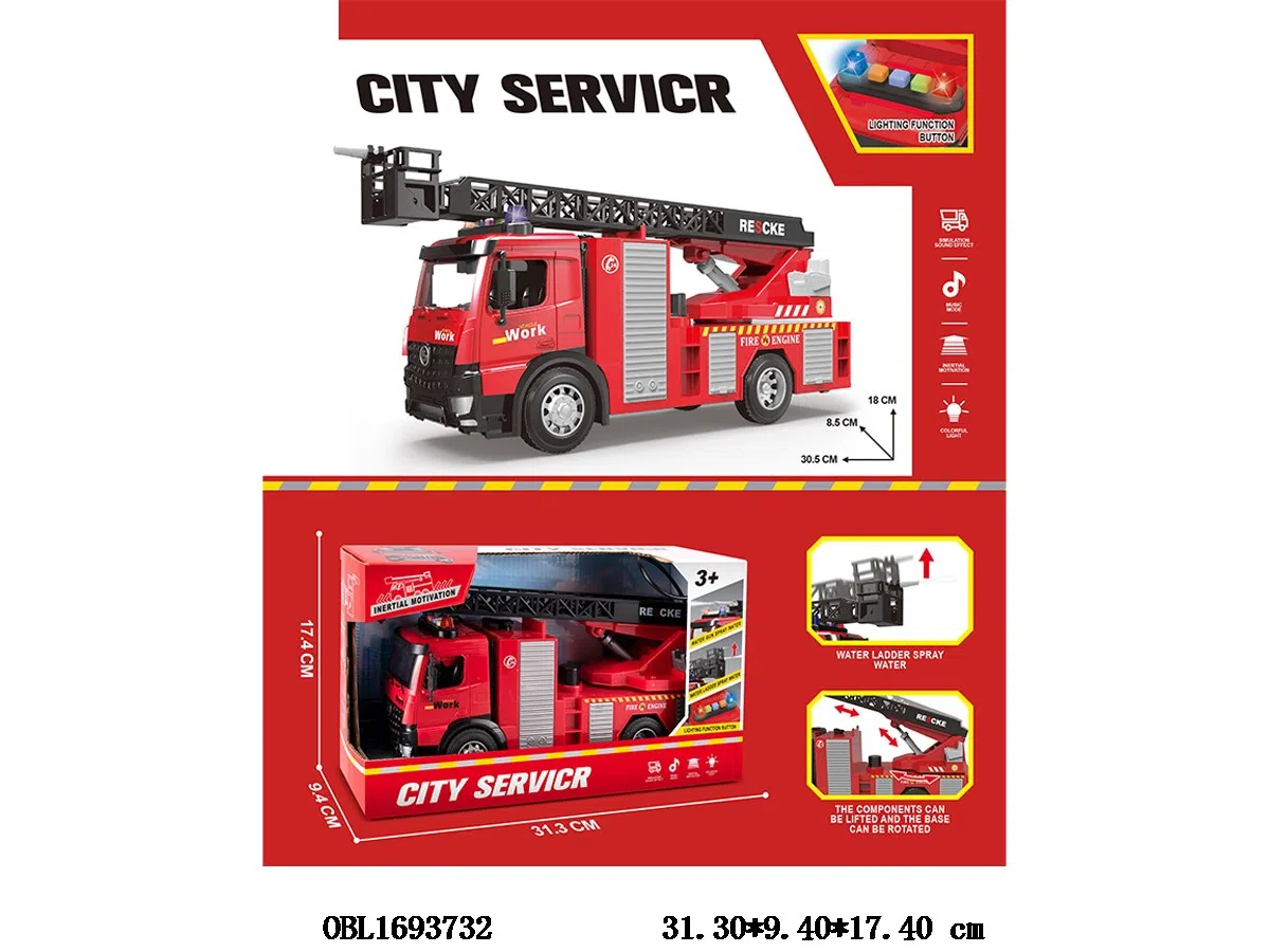 Home > F/P Car > Inertial button fire truck with lighting, music, sprinkler, cloud ladder, adjustable 3 * AG13, power included