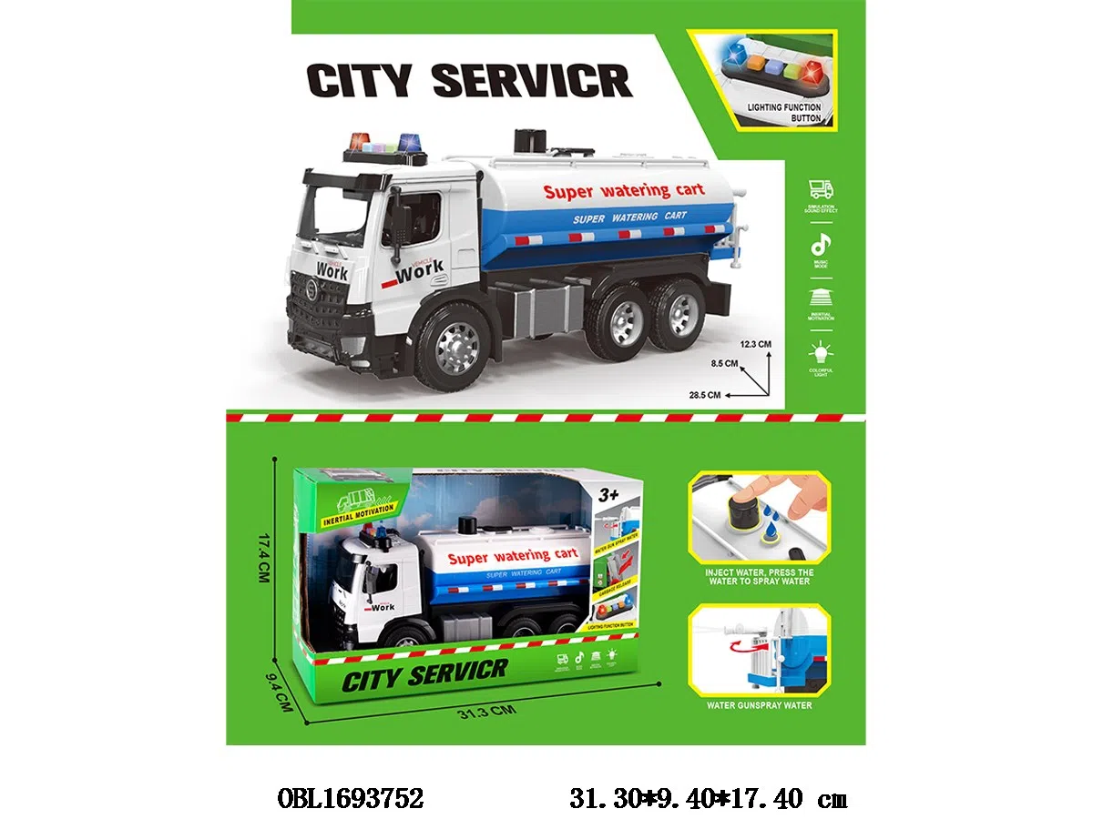 Inertial button sprinkler truck with lights and music, capable of watering 3 * AG13 with electricity included