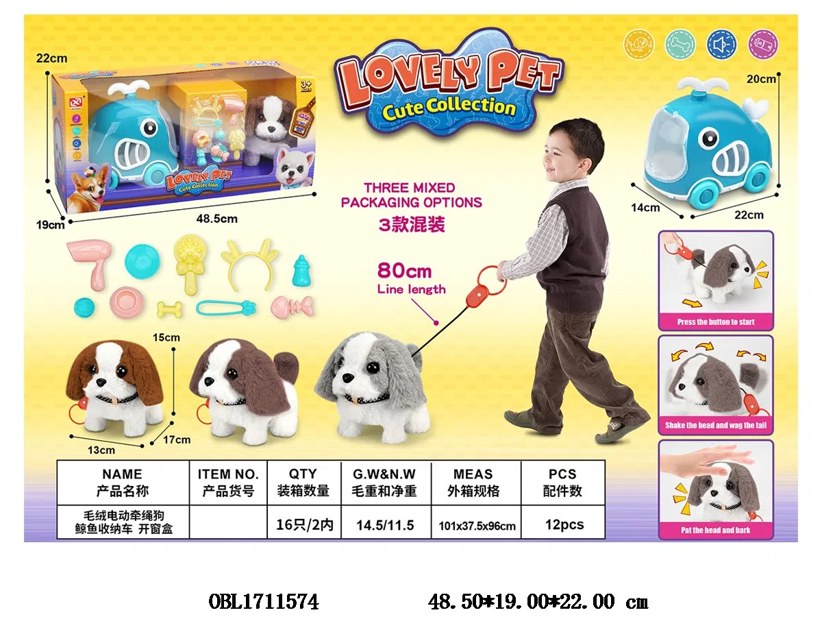 Plush electric dog set with sound and whale storage cage. Car with drawstring 2 * AA, no electricity included. 3 colors mixed