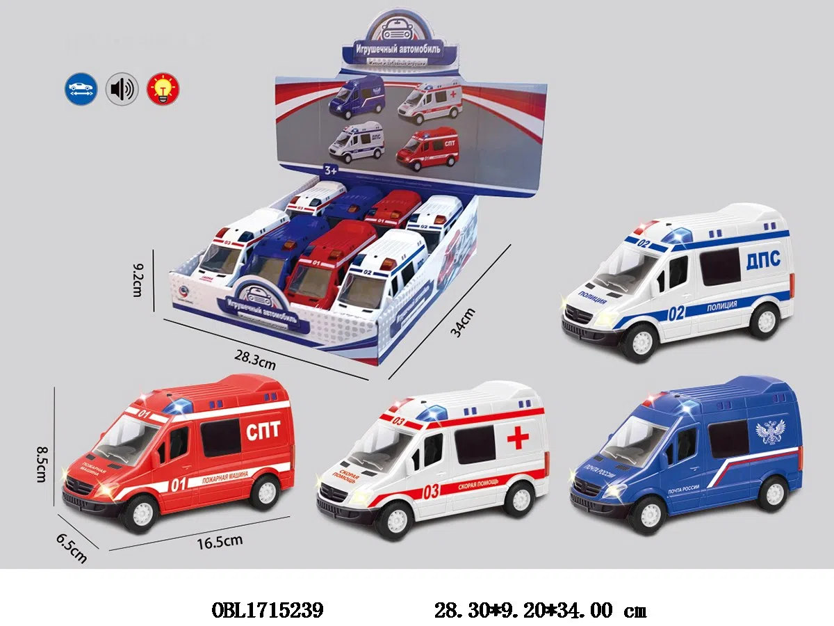 Russian inertia car with lighting, music, 3 * AG13, electric package, 8 pieces per display box, 4 mixed designs