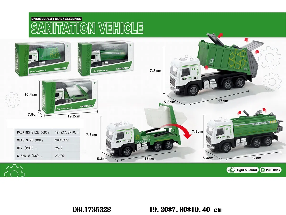 Alloy European style regenerative sanitation vehicle with lighting and sound, 3 * AG13, including electricity, 3 mixed models