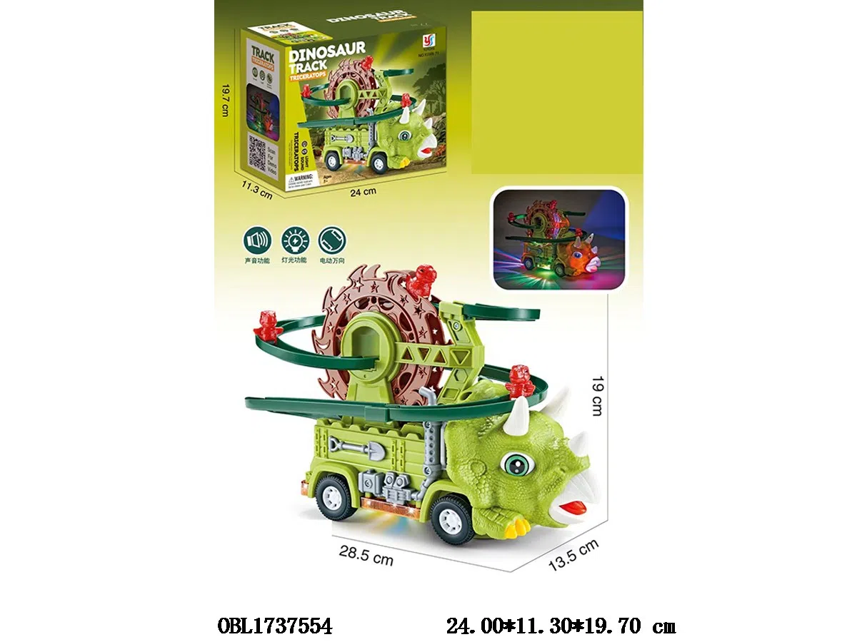 Home > B/O Car > Electric universal triangle dragon car with lights and music, 3 small dinosaurs sliding on track, 3 * AA, no power included