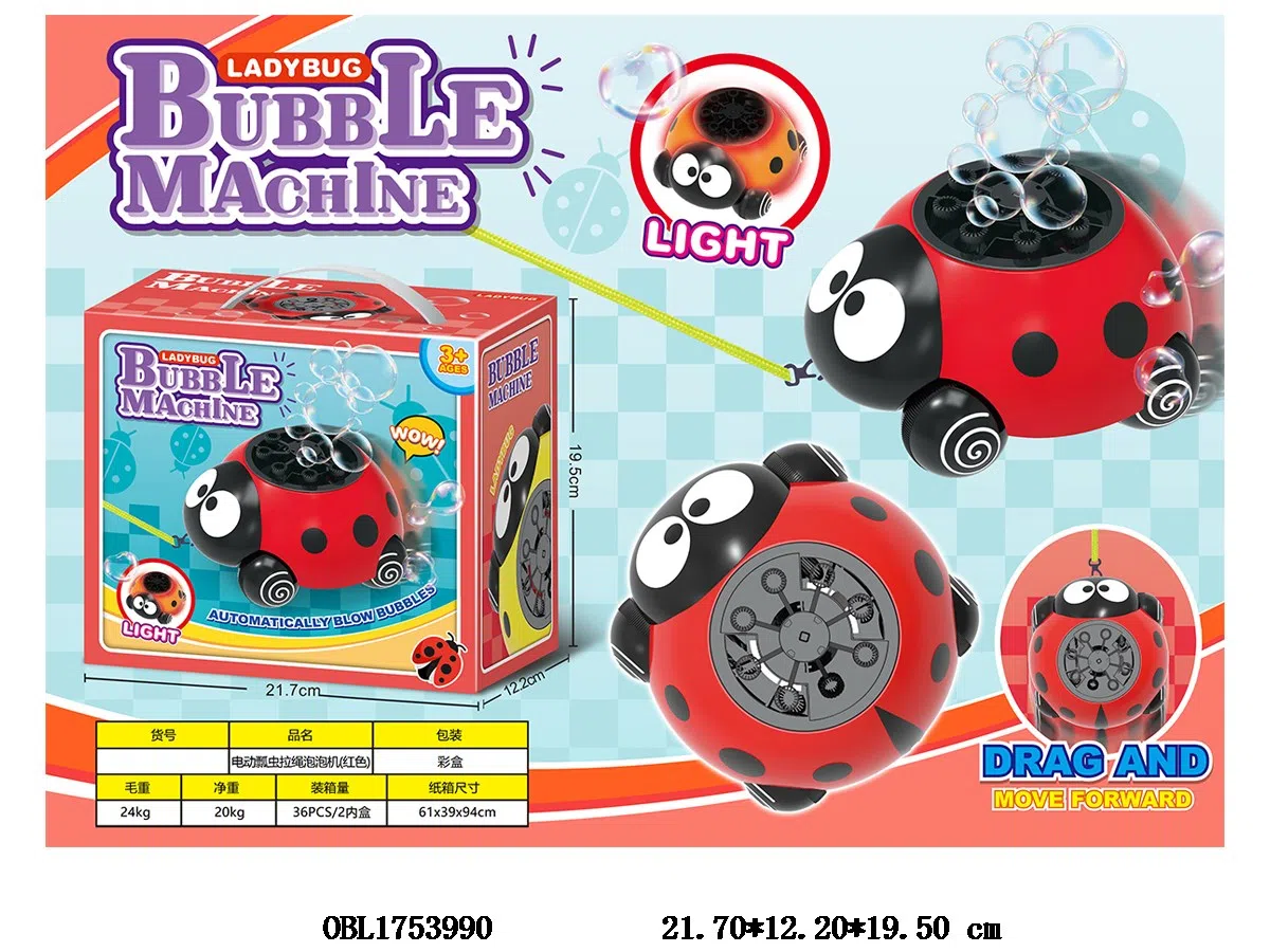 Electric Seven Star Ladybug Traction Rope Bubble Machine with Light and USB Cable 3.7V Lithium Battery Pack 2 Bottles 50ML Bubble Liquid Red