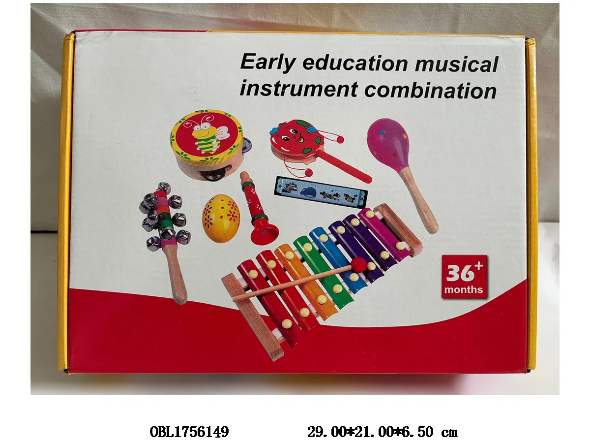 Instrument combination set, percussion, sand hammer, harmonica, shaking drum, shaking bell, flute, sand egg, wooden airplane box