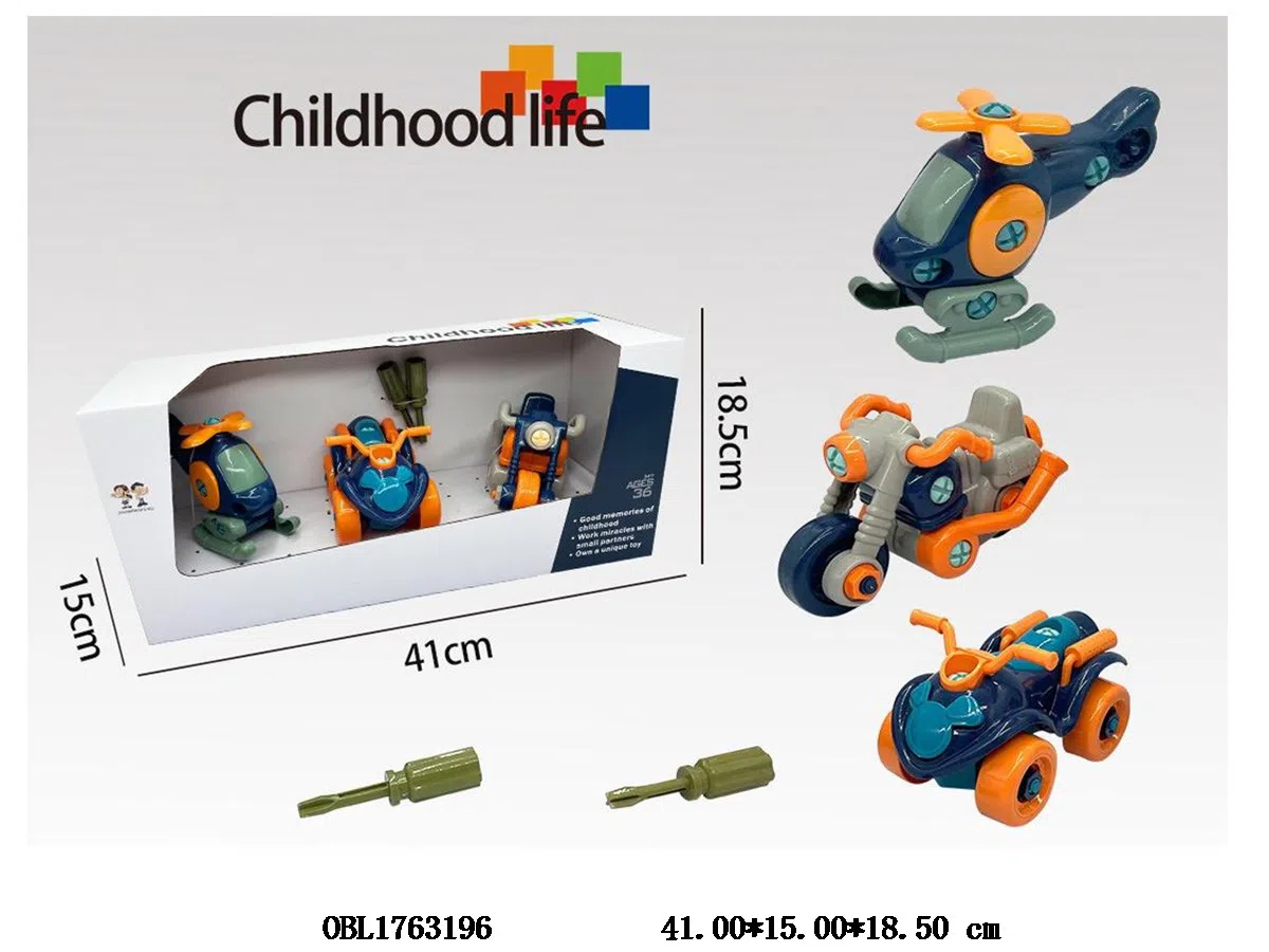 3 motorcycles/airplanes with random color for disassembly and assembly