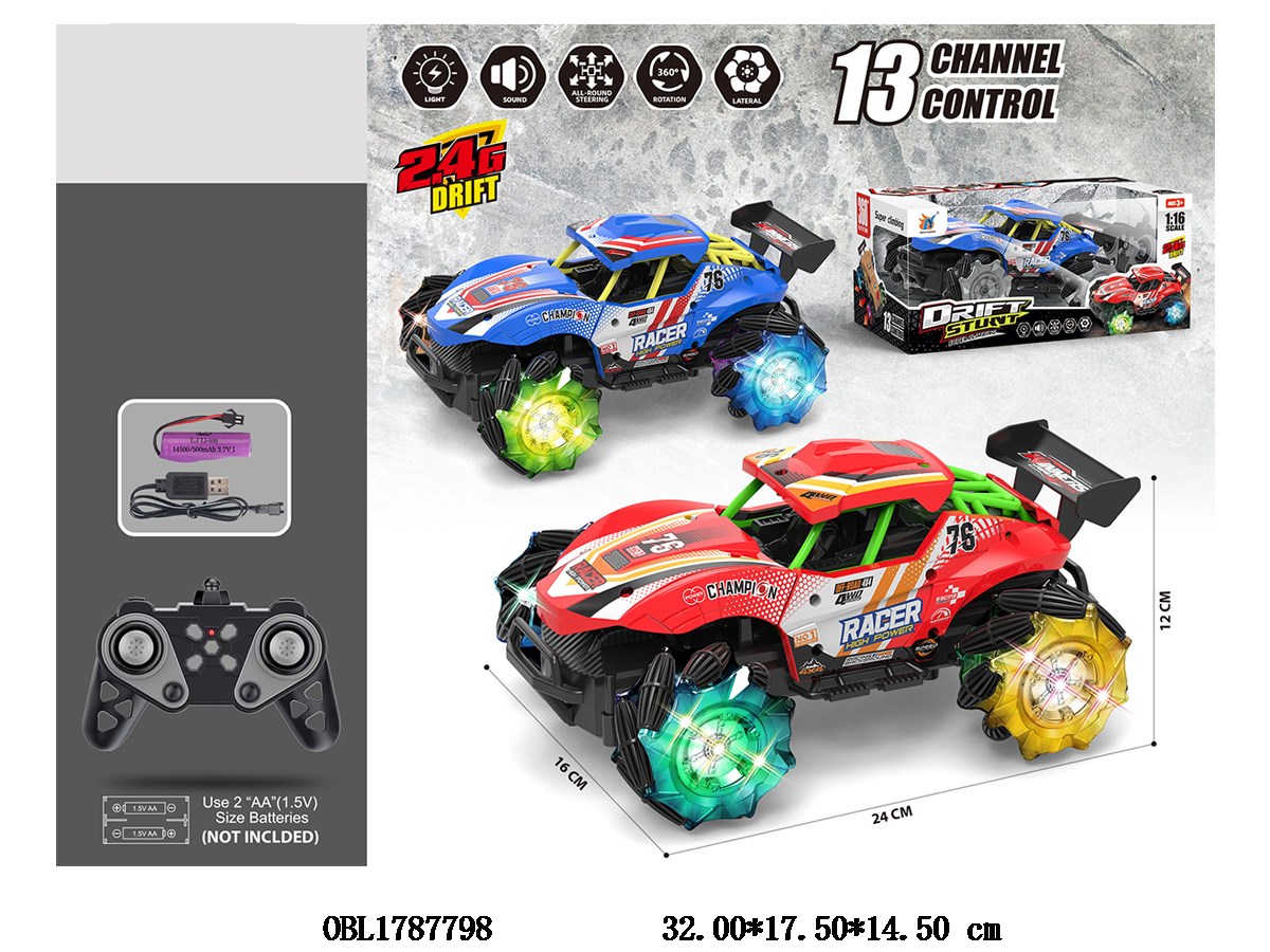 Home > R/C Car > 1: 16 Thirteen Way Side Drift Remote Control Car with Colorful Sound and Light Equipped with USB Cable Body 3.7V Lithium Battery Powered Remote Control 2 * AA Non Powered 2.4G Frequency 2-Color Hybrid