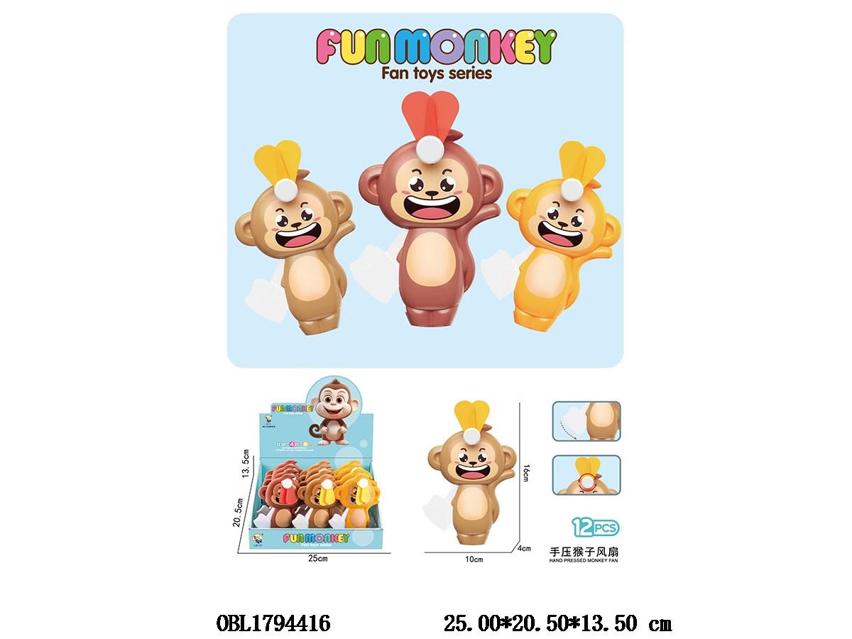 Hand pressed monkey fan, 12 pieces per display box, 3-color mixed packaging