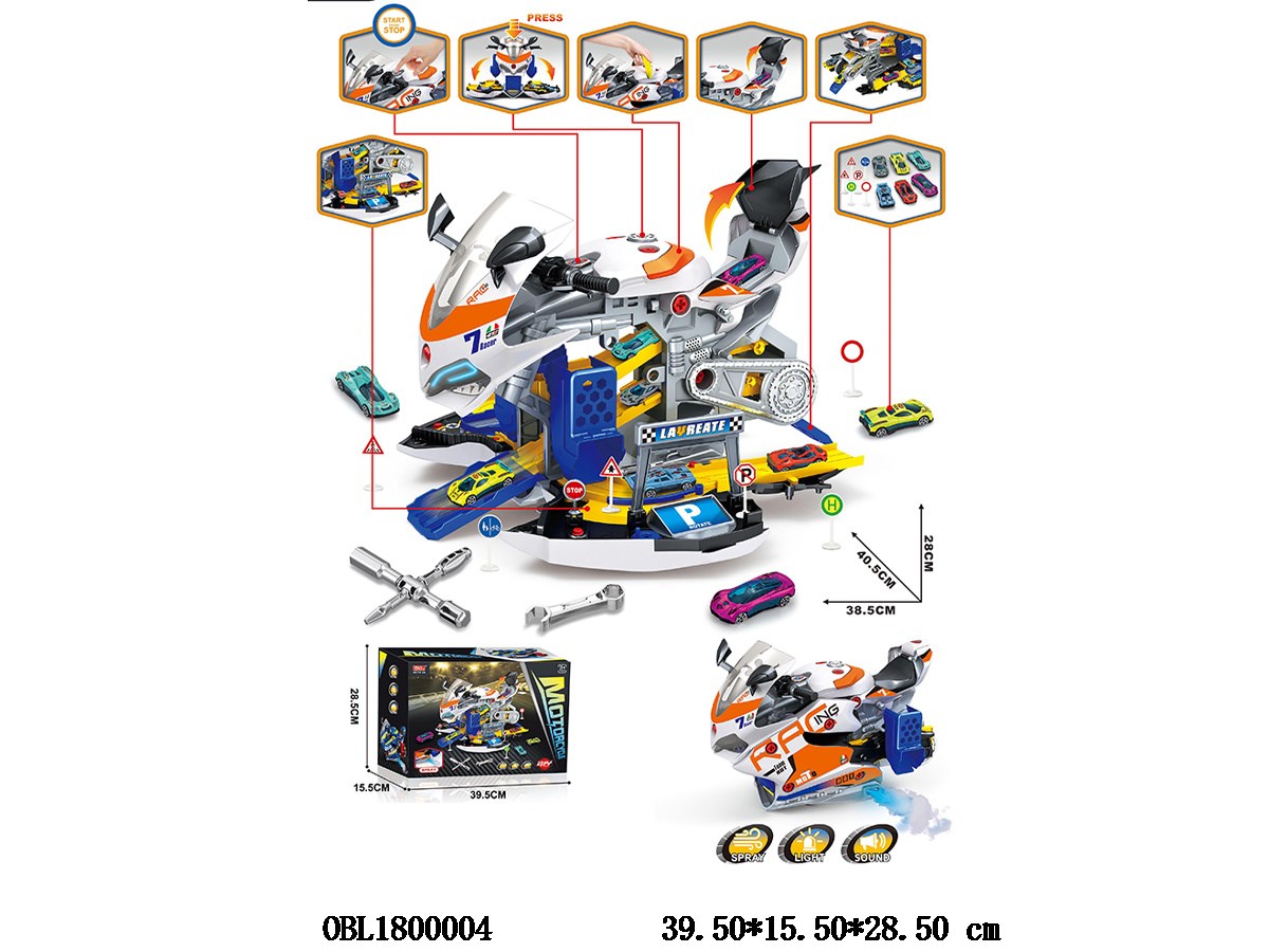 Home > DIY Parking Lot > DIY assembled motorcycle track parking lot package with light and sound effect spray, 6 alloy taxiing racing cars, 3 * AAA, no electricity included