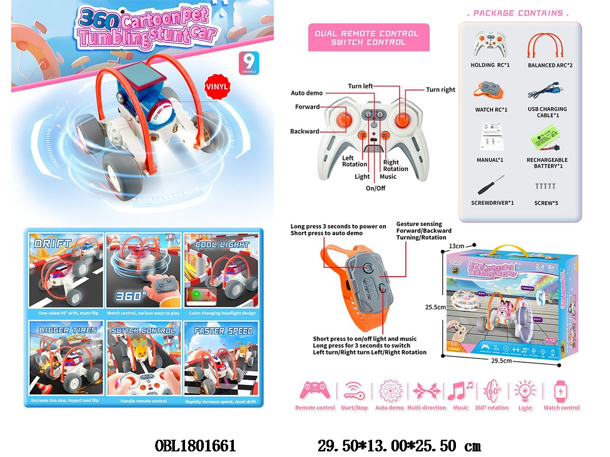 Dual remote control nine way remote control vinyl cartoon stunt car with lights and USB cable body 7.4V lithium battery included remote control 2 * AA non included power watch remote control 2 * AAA non included power 2.4G frequency
