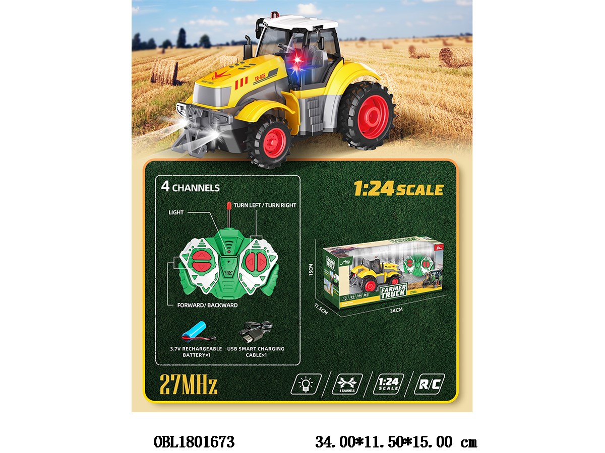 1: 24 way remote control farmer s car with lights and USB cable. Body 3.7V lithium battery with remote control 2 * AA without power. 27 frequency