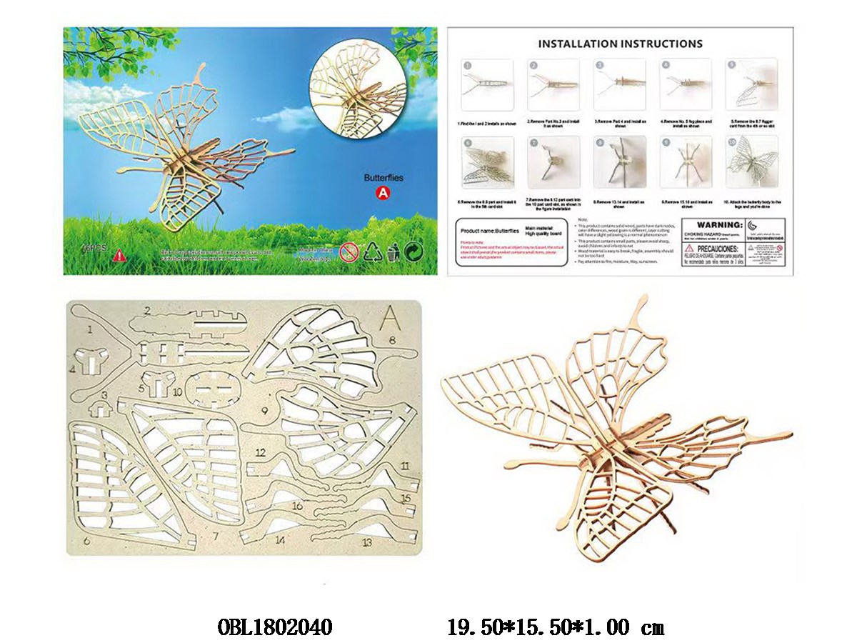 Wooden three-dimensional puzzle butterfly with multiple shapes to choose from and mix freely