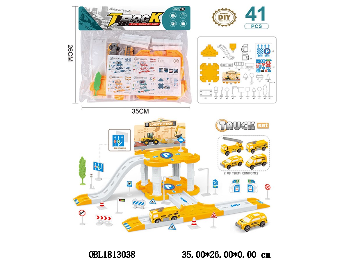 Self installed parking lot set with 2 sliding cars