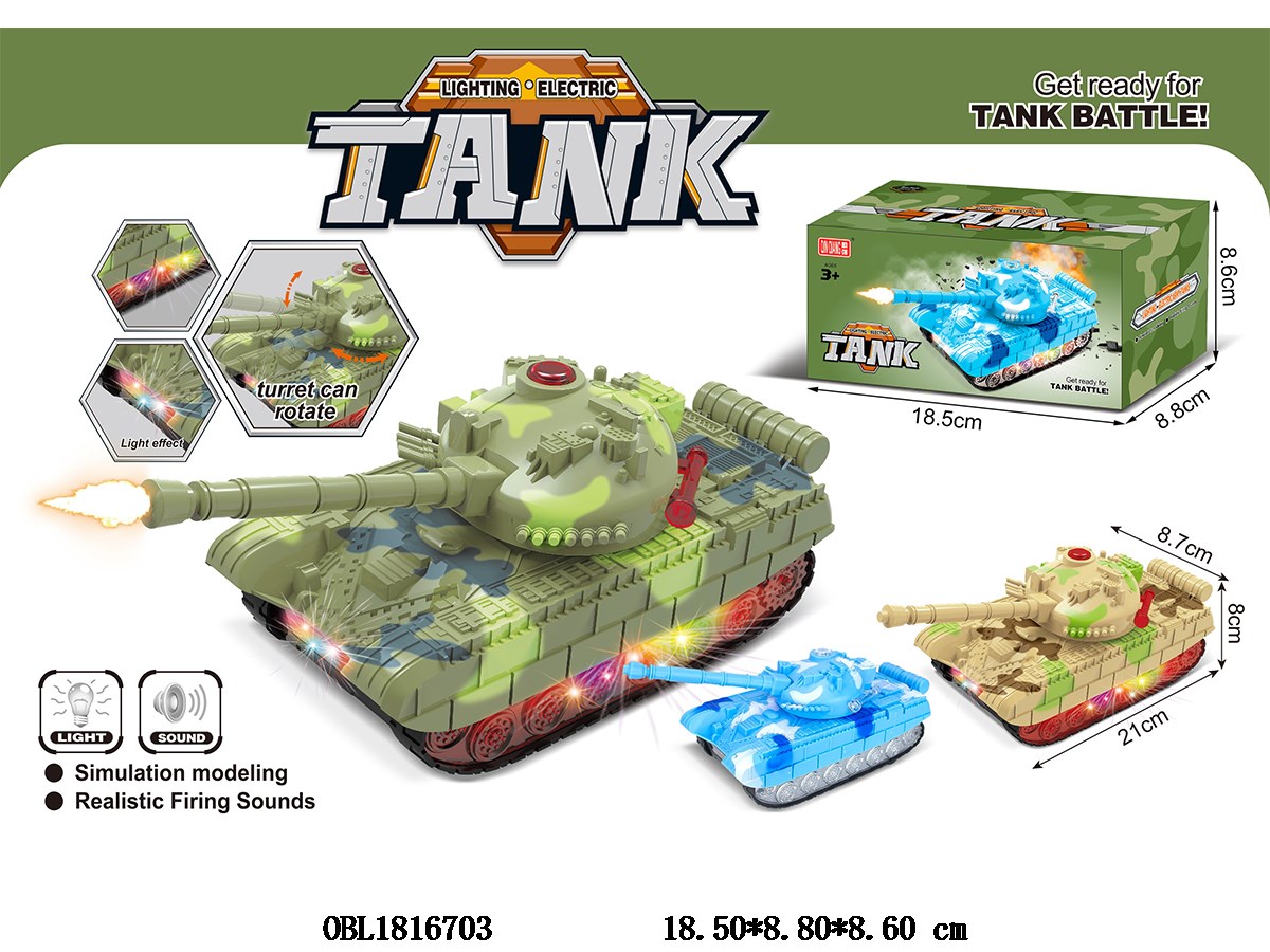 Electric tank with lights, music, 3 * AA, no electricity included, 3 colors mixed