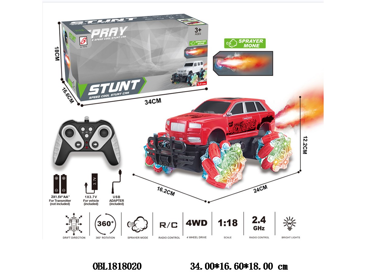 Home > R/C Car > Jiutong remote control vehicle with light spray, USB cable, body 3.7V battery pack, electric remote control, 2 * AA, no power pack, 2.4G frequency, mixed red/black