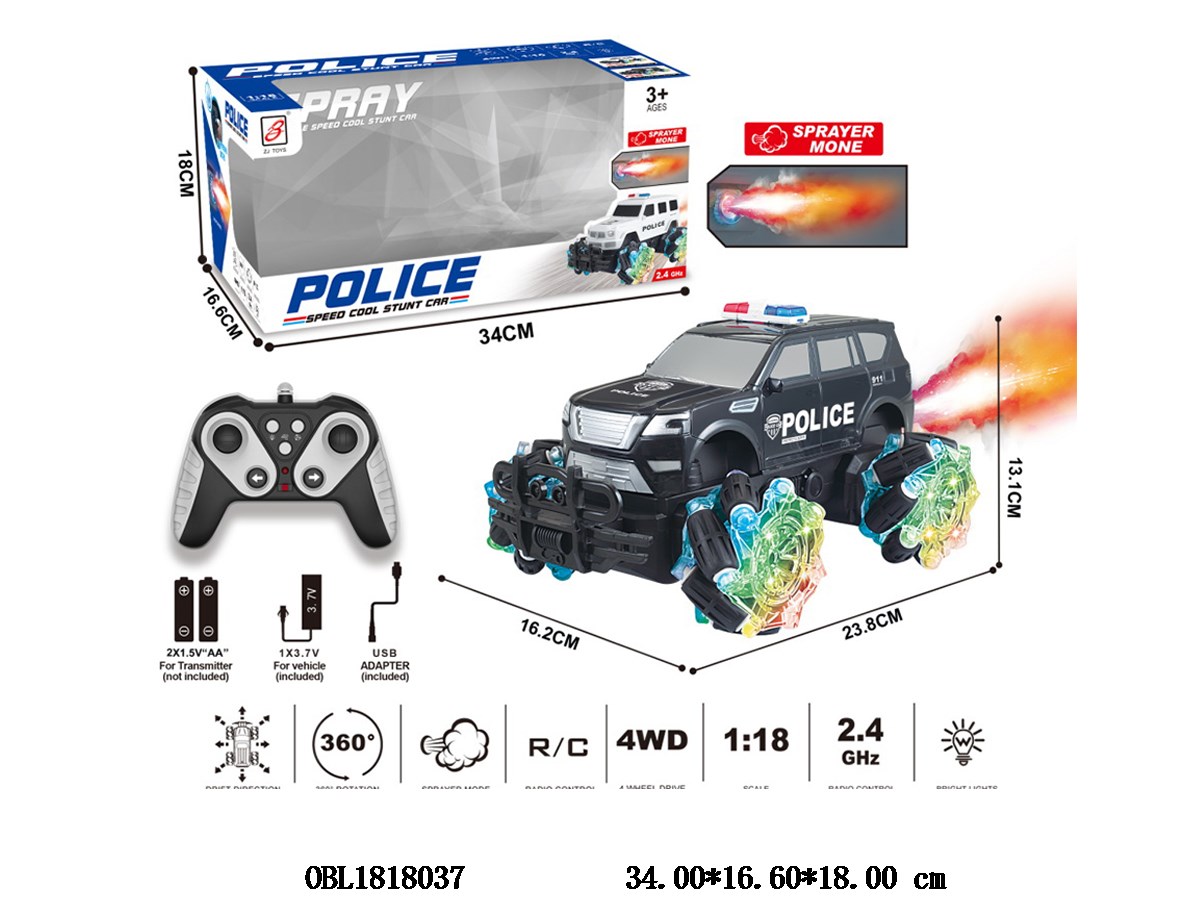 Jiutong remote control police car with lights, spray, USB cable, body 3.7V battery pack, electric remote control, 2 * AA, no power pack, 2.4G frequency, white/black mixed