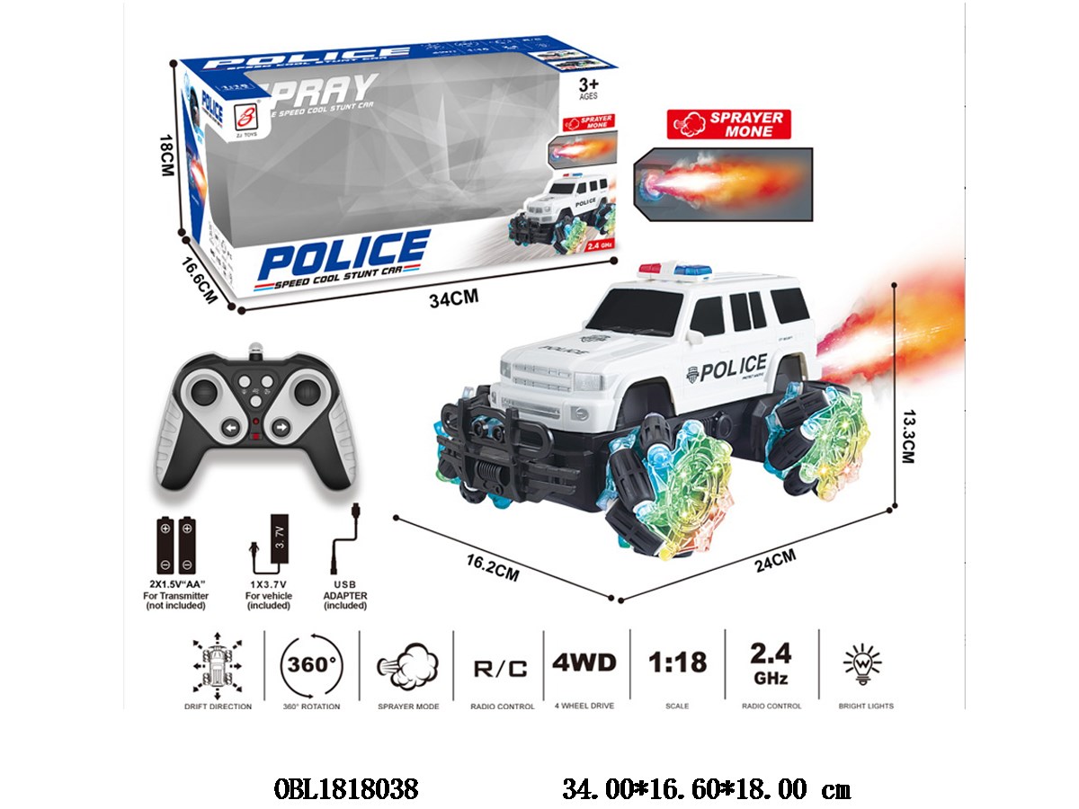 Jiutong remote control police car with lights, spray, USB cable, body 3.7V battery pack, electric remote control, 2 * AA, no power pack, 2.4G frequency, white/black mixed