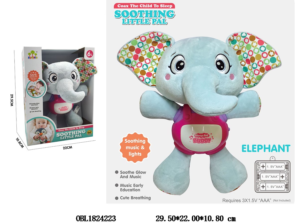 Plush calming elephant with lighting and music 3 * AAA, no electricity included