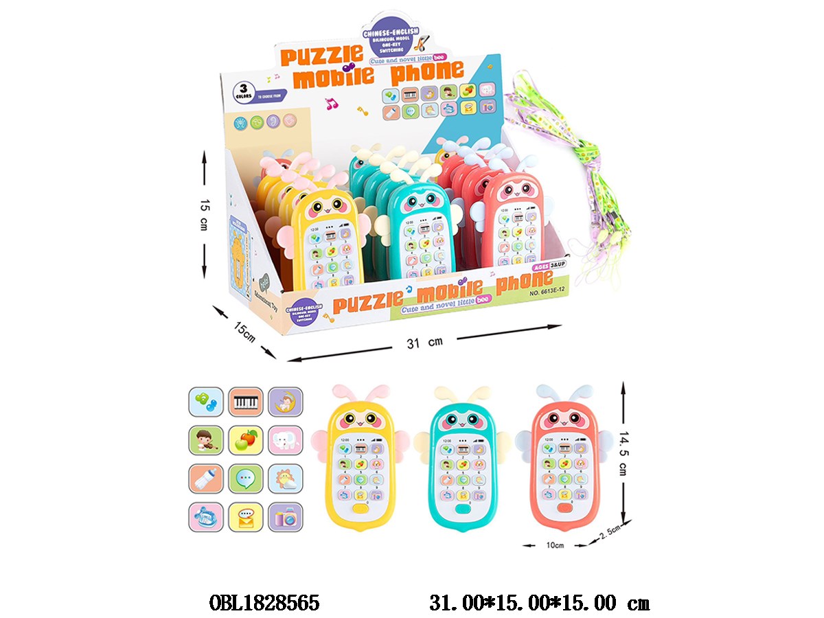 English puzzle little bee mobile phone with music 2 * AAA, no electricity, 3 colors mixed, 12 pieces, 1 display box