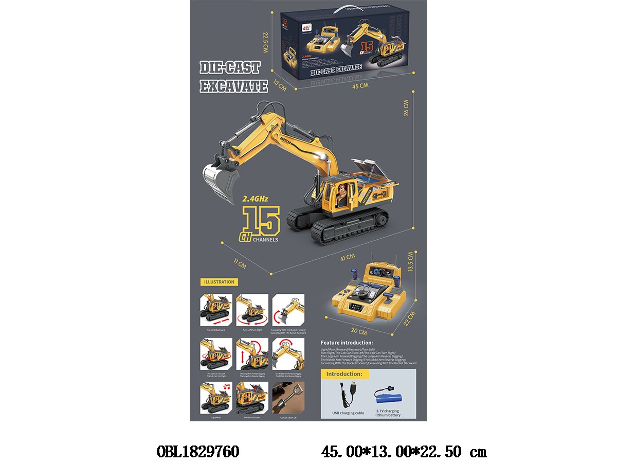 15 way steering wheel remote control alloy excavator with lights, music and USB cable, 3.7V car body, power included remote control 2 * AA, no power included 2.4G