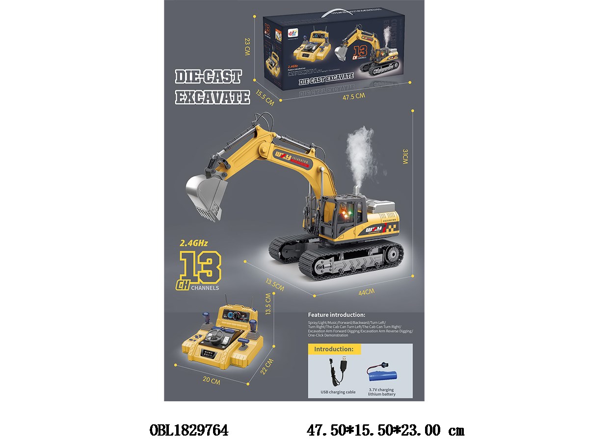 13 way steering wheel remote control alloy excavator with light, music, spray, USB cable, body 3.7v, electric remote control, 2 * AA, non electric 2.4G