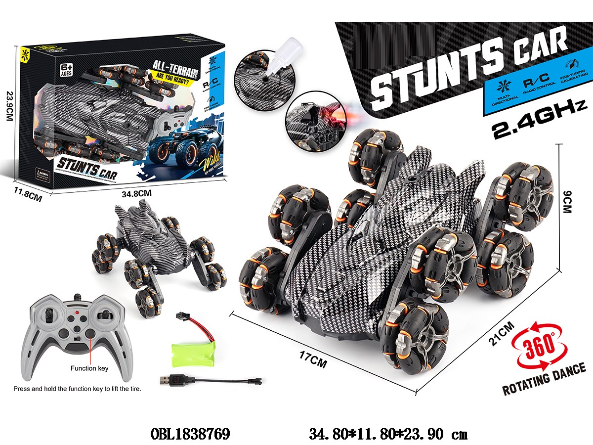 Eight wheel remote control stunt vehicle with light spray drift, equipped with USB cable, body 7.4V rechargeable battery pack, electric remote control, 2 * AA, no power pack, 2.4G frequency