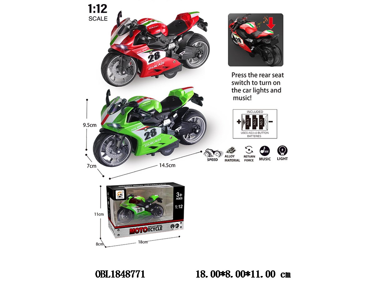 1: 12 alloy regenerative motorcycle with lights, music, 2 colors mixed, 3 * AG3, electric included