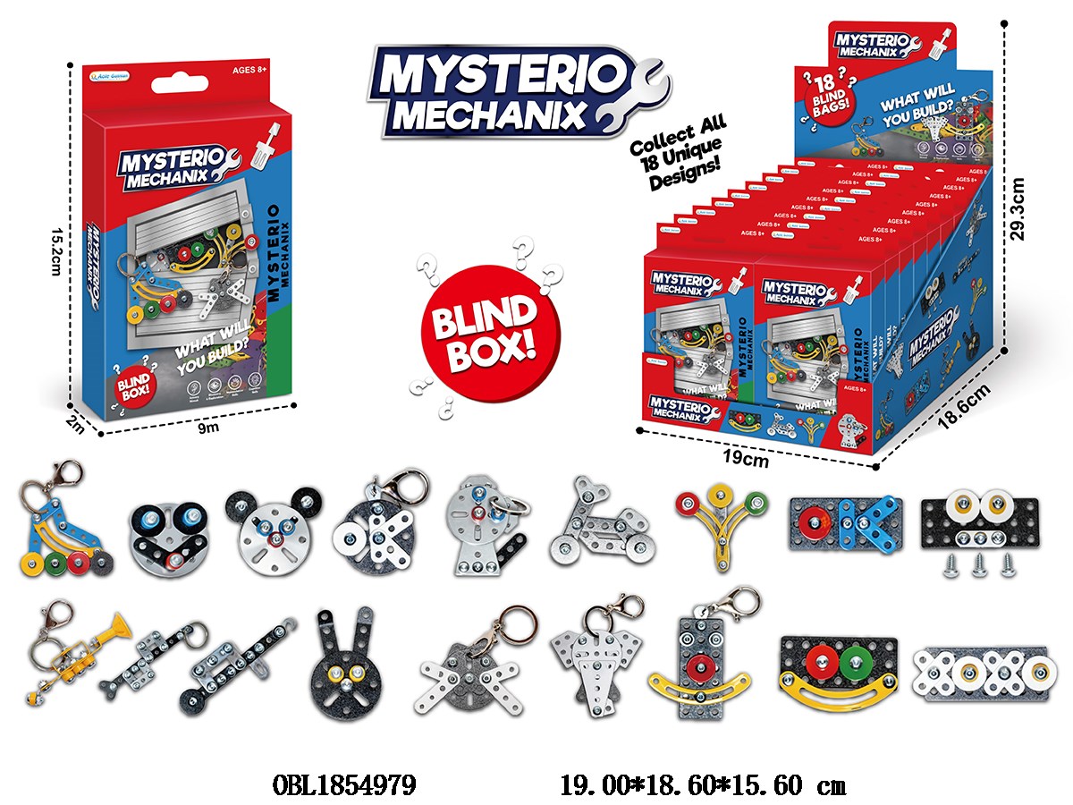 Puzzle metal building block keychain blind box, 18 mixed types, 16 boxes, 1 display box