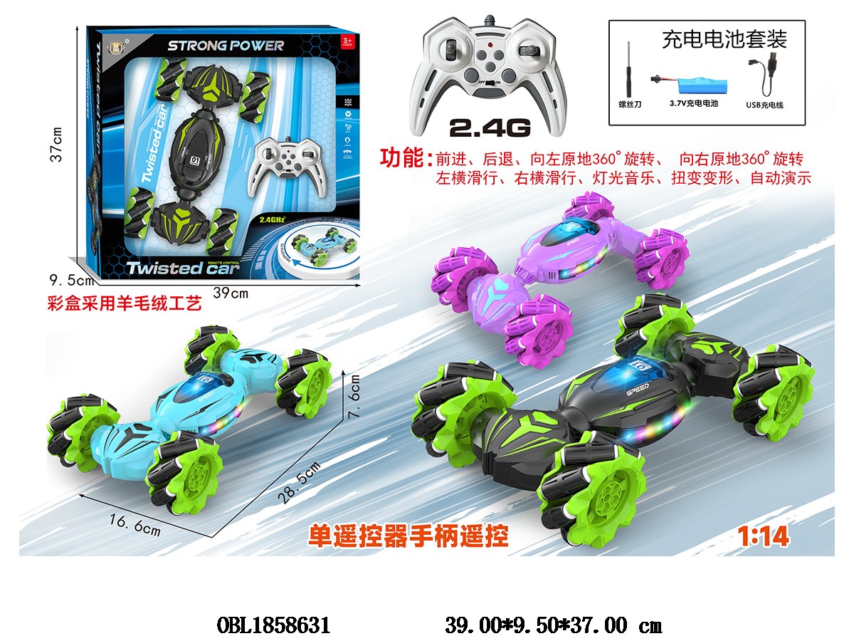 Dual remote control stunt twist car with lighting and music, equipped with USB cable, 3.7V lithium battery with built-in remote control, 2 * AA without built-in power, 2.4G frequency, 3-color hybrid