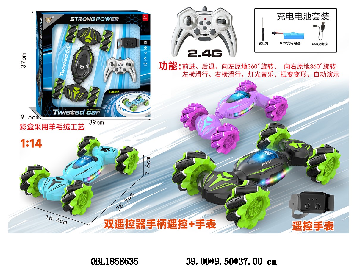 Dual remote control stunt twist car with lighting and music, equipped with USB cable, 3.7V lithium battery included remote control, 2 * AA non included remote control, watch remote control, 3 * AAA non included remote control, 2.4G frequency, 3 colors mixed