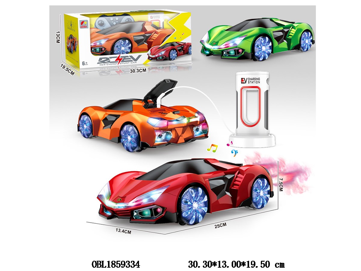 Eight way remote control stunt car with light, music programming, spray drift, USB cable, body, 3.7V battery pack, electric remote controller, 2 * AA, no power pack, 2.4G frequency, three color mixed installation