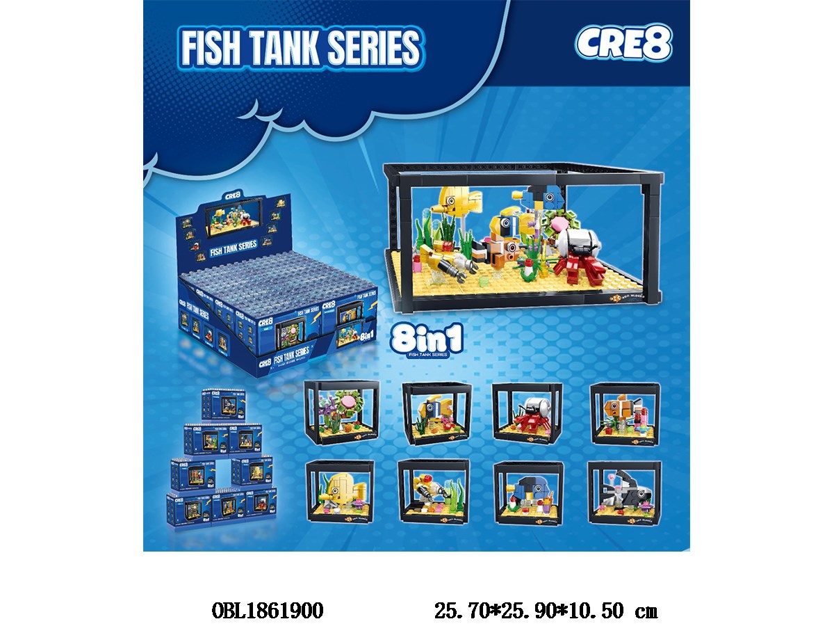 Puzzle building block fish tank 8-in-1, 8 mixed designs, 8 small boxes, 1 display box